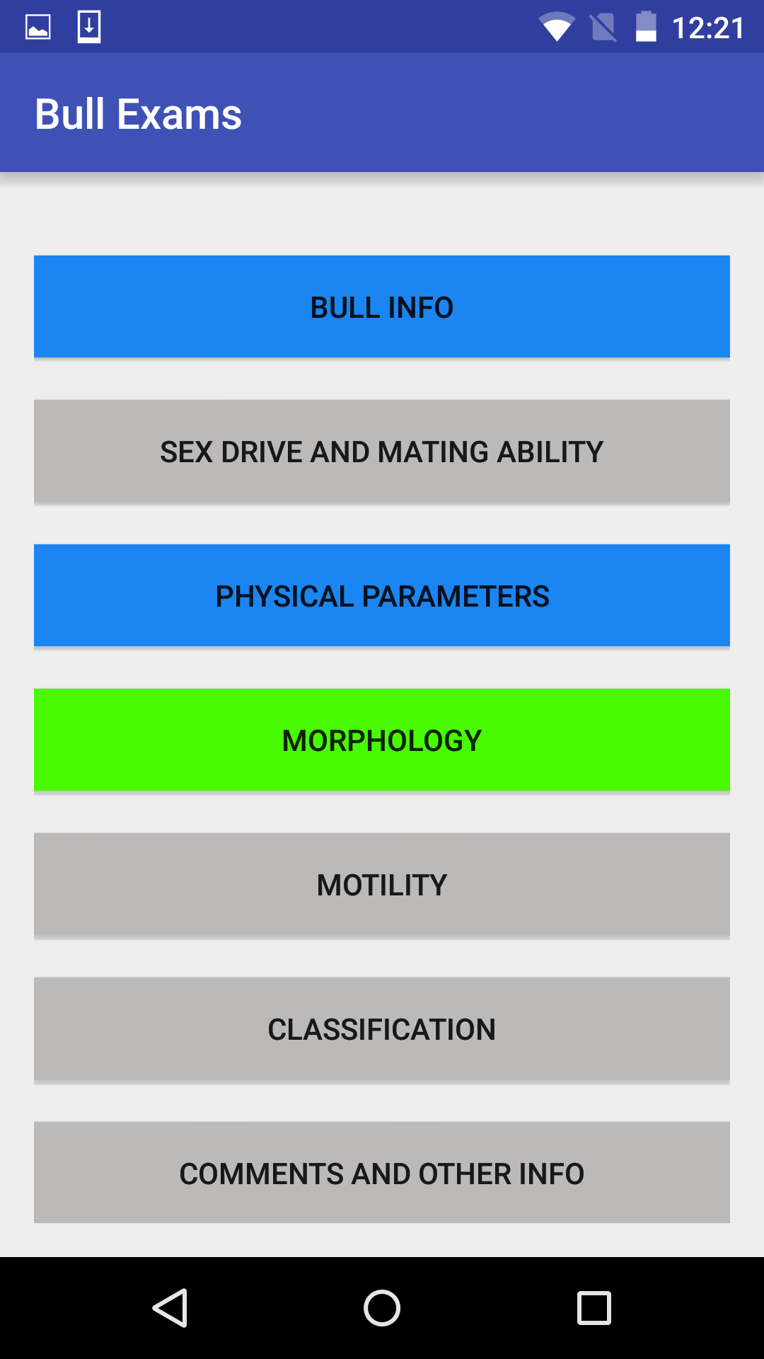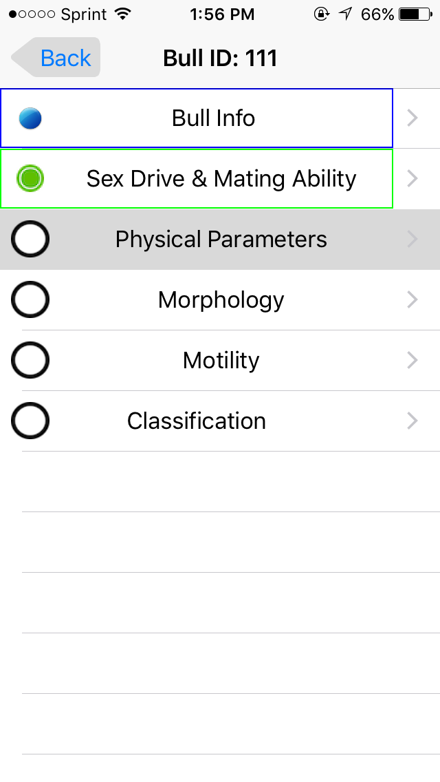 This screen allows you to enter various data about the bull being examined (or edit previously collected data). Data about bulls are grouped into sets of related data, e.g., bull info, morphology, motility. Each group can be accessed by clicking the corresponding button.