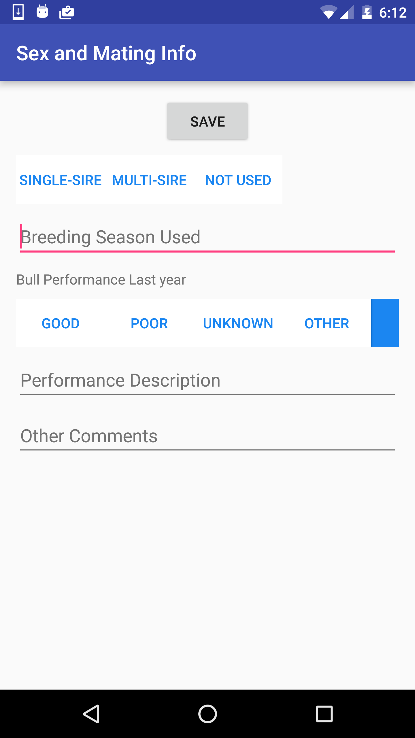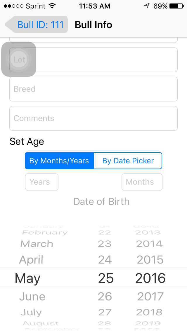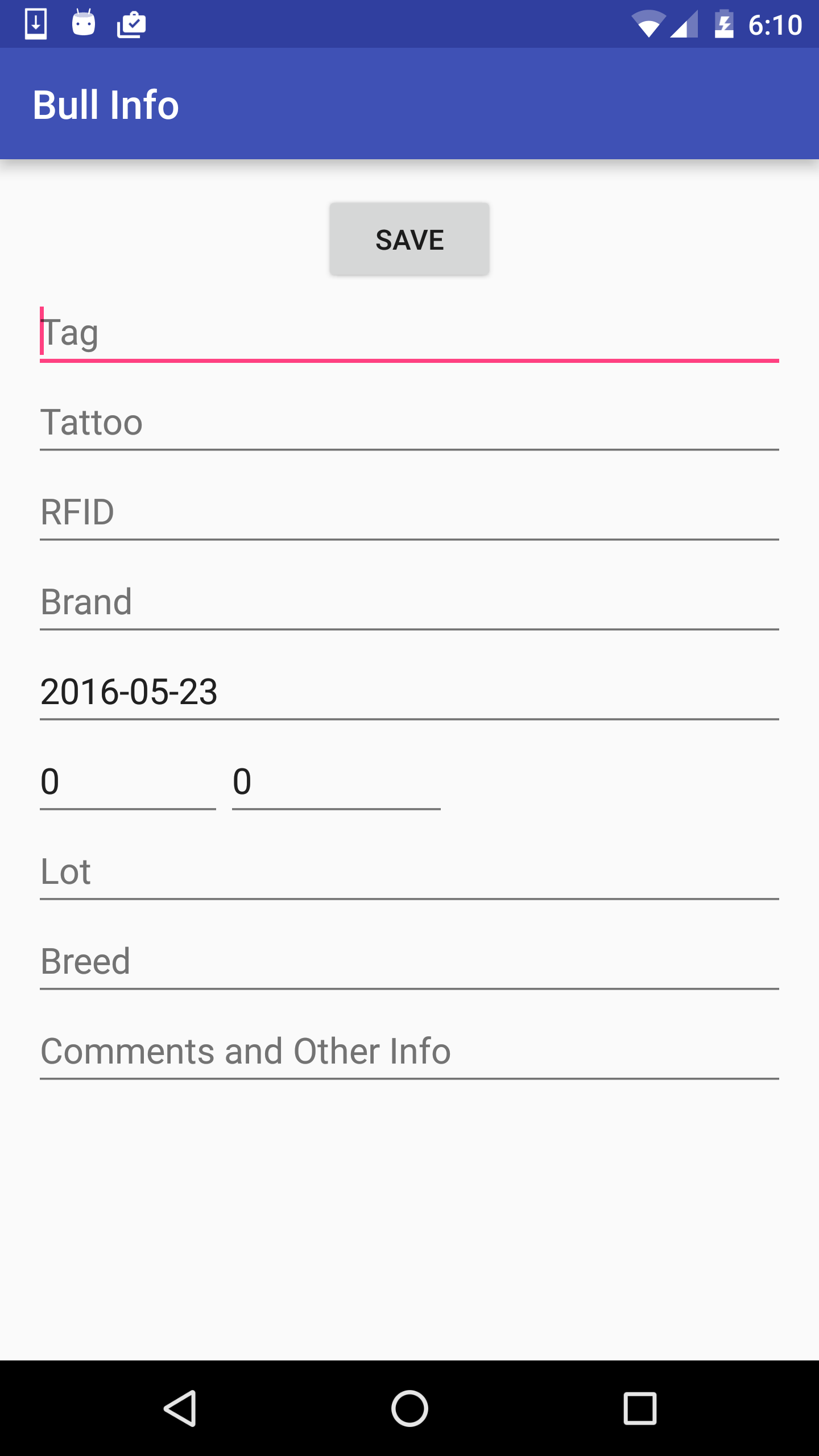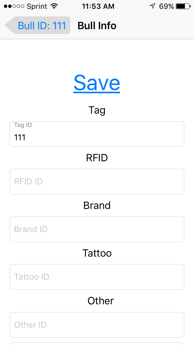 In this screen, each field is associated with a hint that suggests the type of information accepted by the field. A field is highlighted in red if you enter invalid data. Also, at least one of the ID fields -- Tag, RFID, Brand, and Tattoo -- has to be filled. The age of a bull is mandatory. If you provide the date of birth, the age of the bull will be automatically filled. Remember to click on the Save button after you have entered the necessary (mandatory) information.