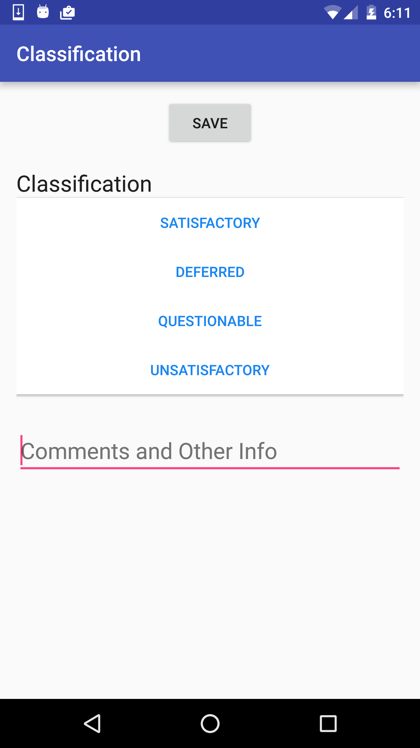 As with previous screens, the data collected on these screens are self explanatory (and hints are associated with fields). Again, remember to Save the data before navigating away from the screen. Also, the app will notify you of invalid data by highlighting the corresponding fields in red.