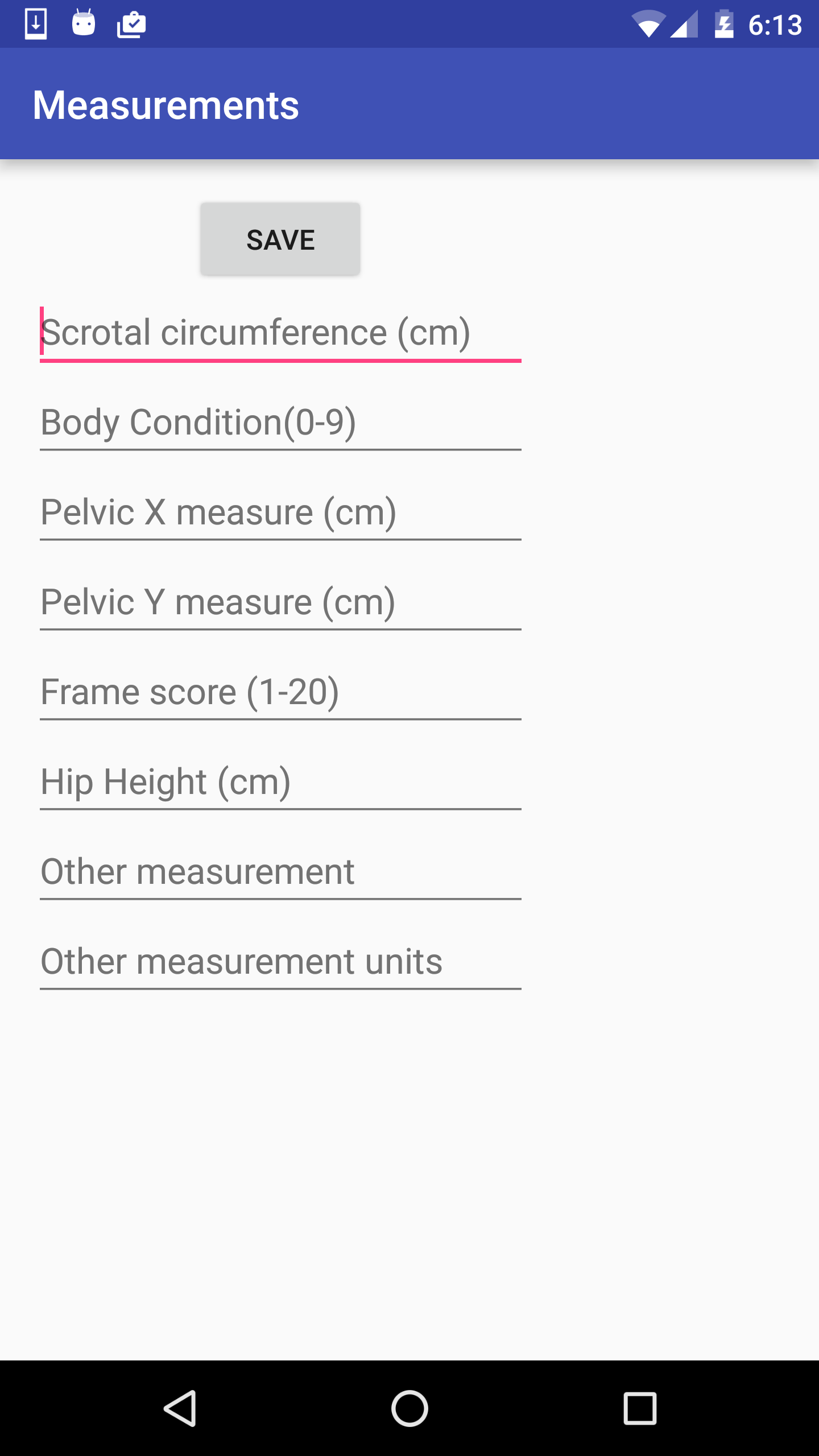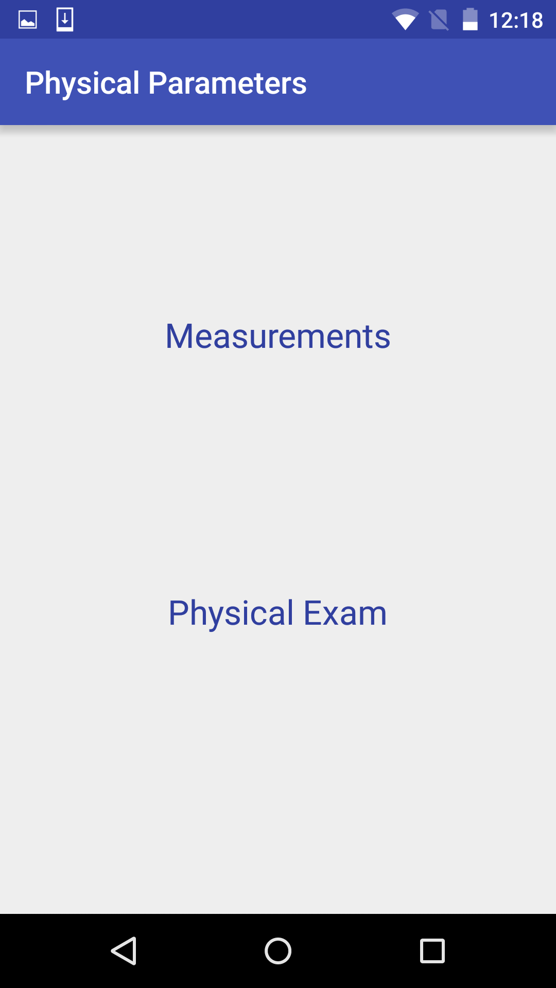 This screen has two buttons. One will take the user to the Measurements screen and the other will take the user to the Physical Exam screen. In these screens, you can enter data in the fields. Again, there will be hints about the type of valid data, and the app will notify you of invalid data by highlighting corresponding fields in red. Also, remember to click the Save button before your navigate away from the screens.