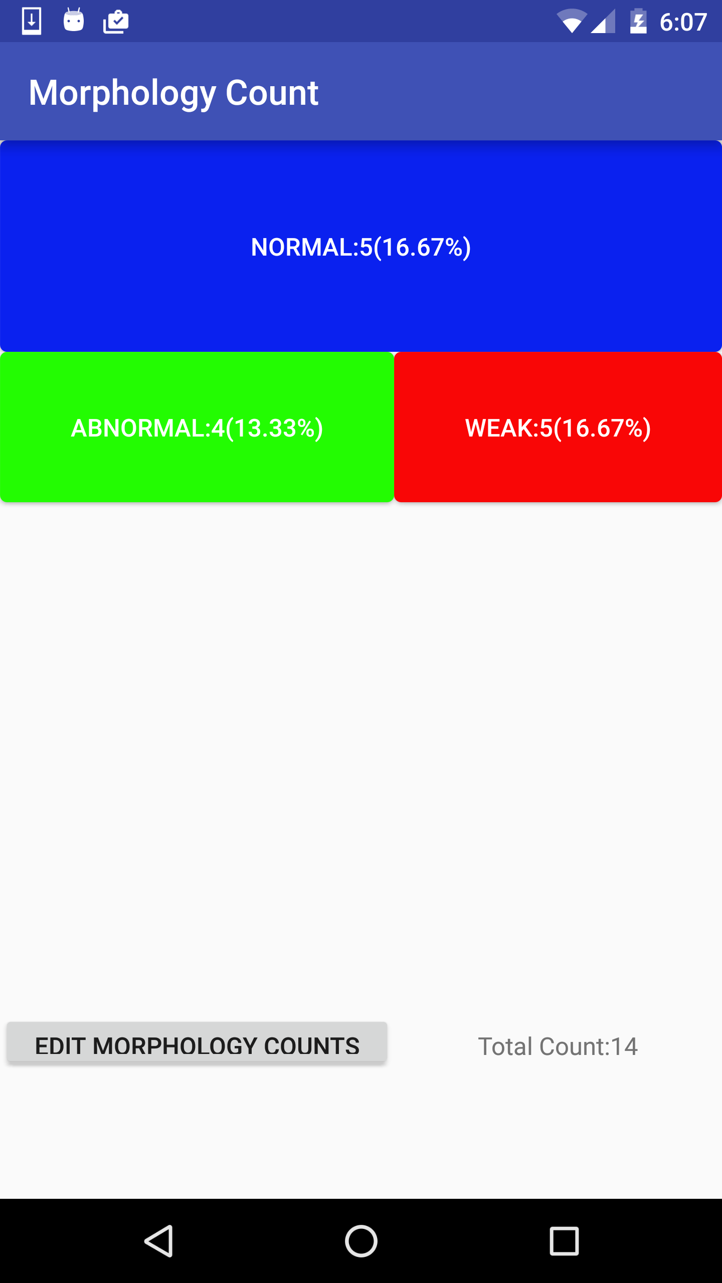 For each semen collection, you can view the total count and the break down via the Morphology Count screen by selecting a specific sample. If needed, you can modify the recorded count in this screen by clicking on the Edit Morphology button at the bottom of the screen.