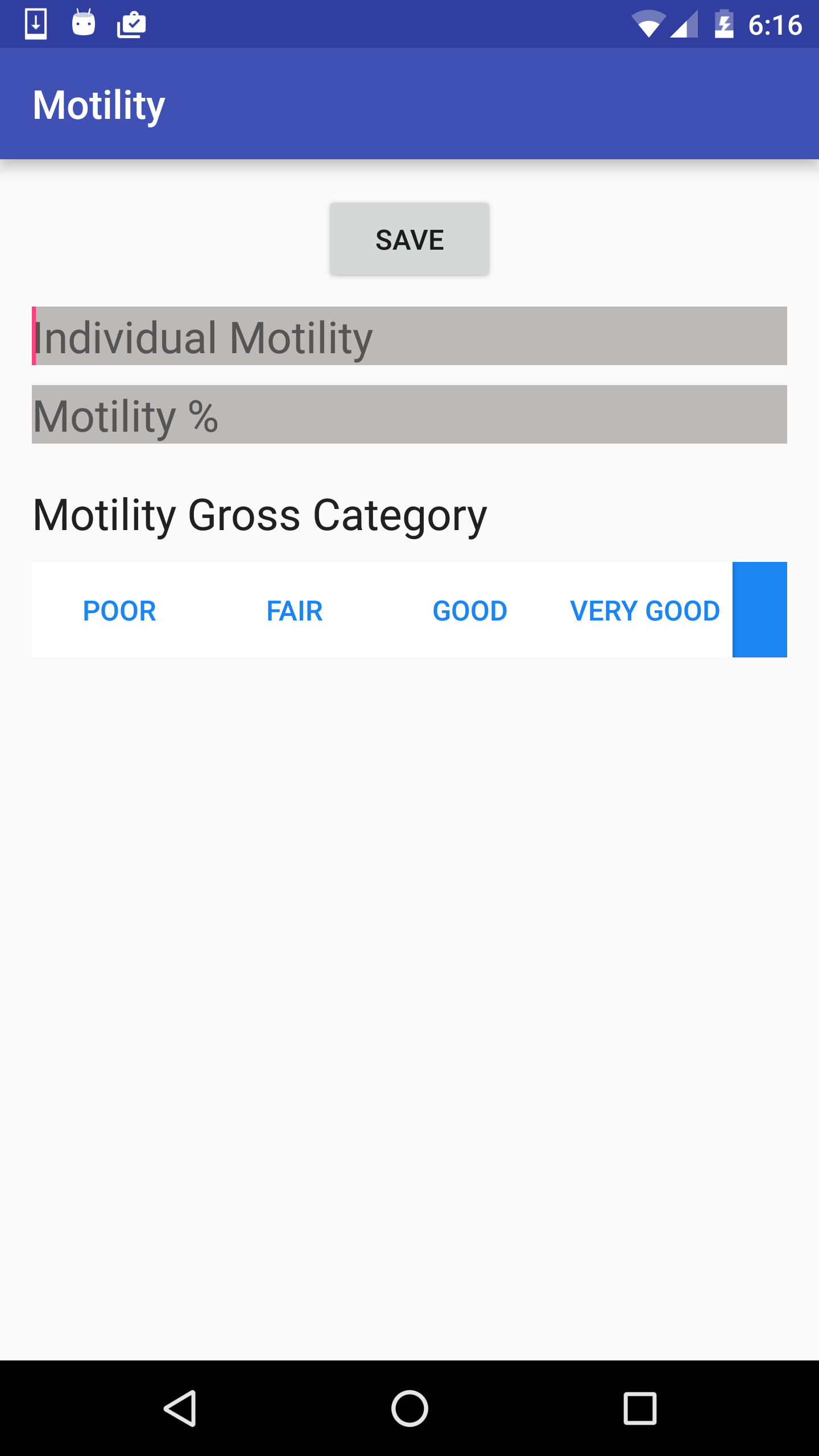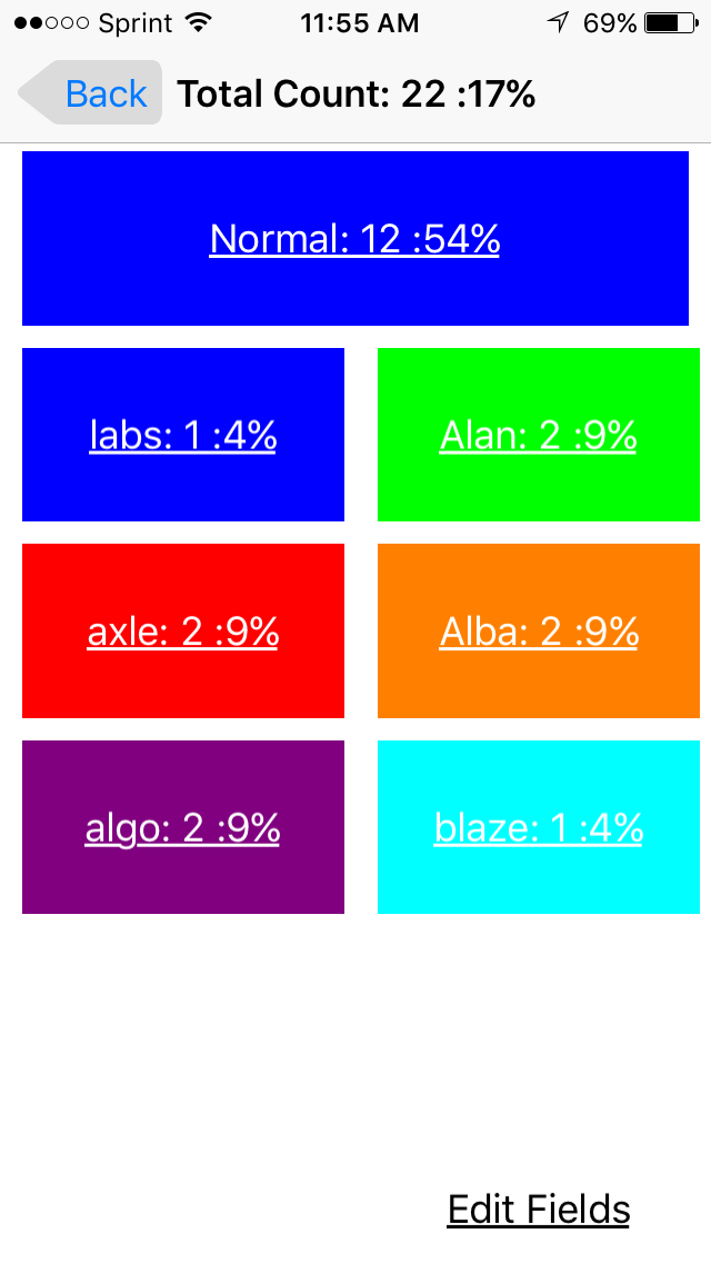 Upon clicking Add New Semen Collection, you will be presented with a page full of buttons (up to eight buttons). These buttons represent the Morphology information you had setup in the Settings section of the app. You can gather tally data for various morphology features by clicking on the corresponding button.