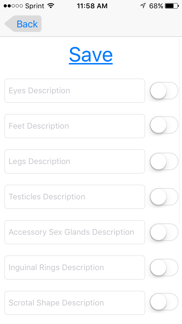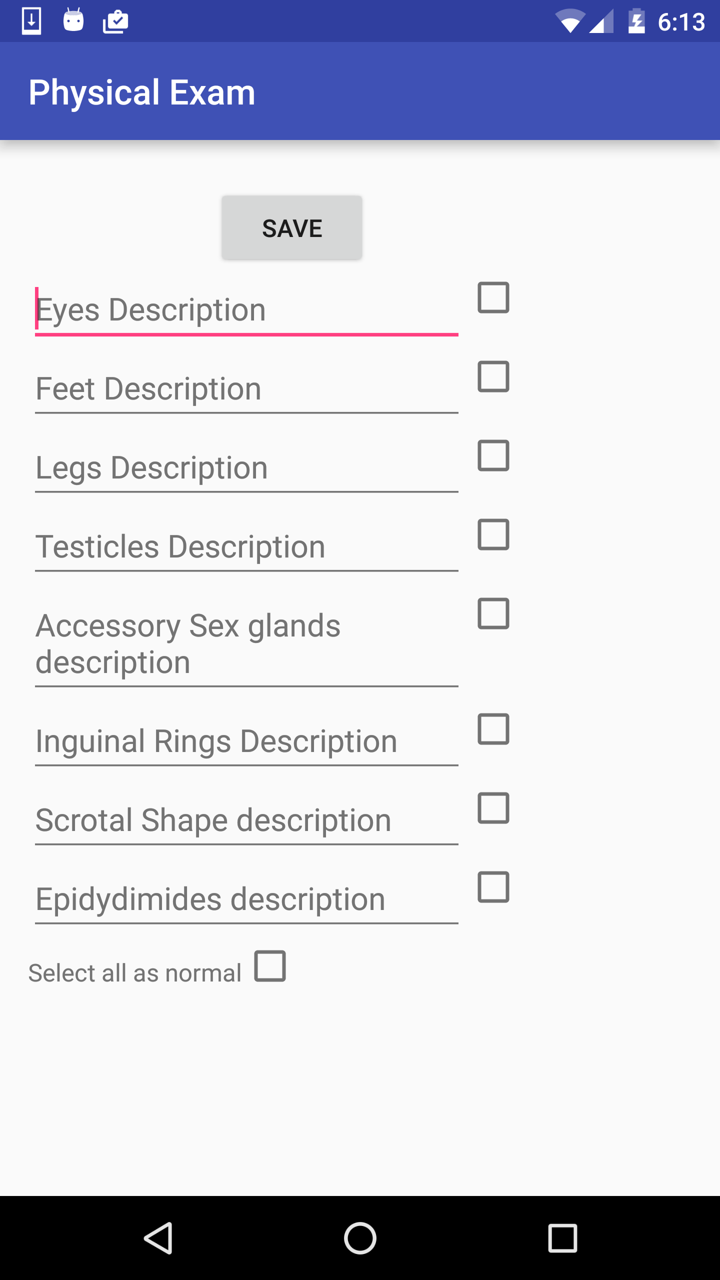 Each field is associated with a check box to indicate "normal" or not. Check this boxes when you do not want to enter a description but want to record the corresponding parameter is normal. If you do not provide any description and not check the corresponding bos, then the app will record the parameter as abnormal. If you wish to record all parameters as normal, then you can use the Select all as Normal check box at the bottom of the screen to mark all parameters as normal -- this will check the check boxes associated with all parameters. Unchecking this check box will uncheck the check boxes associated with all the parameters on the screen.