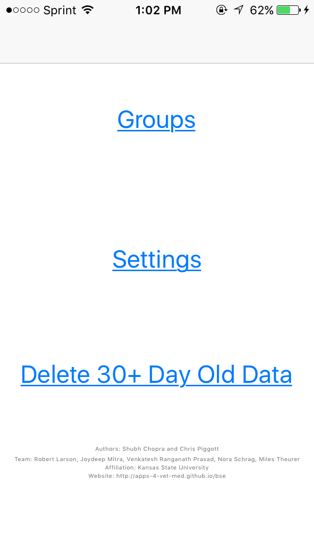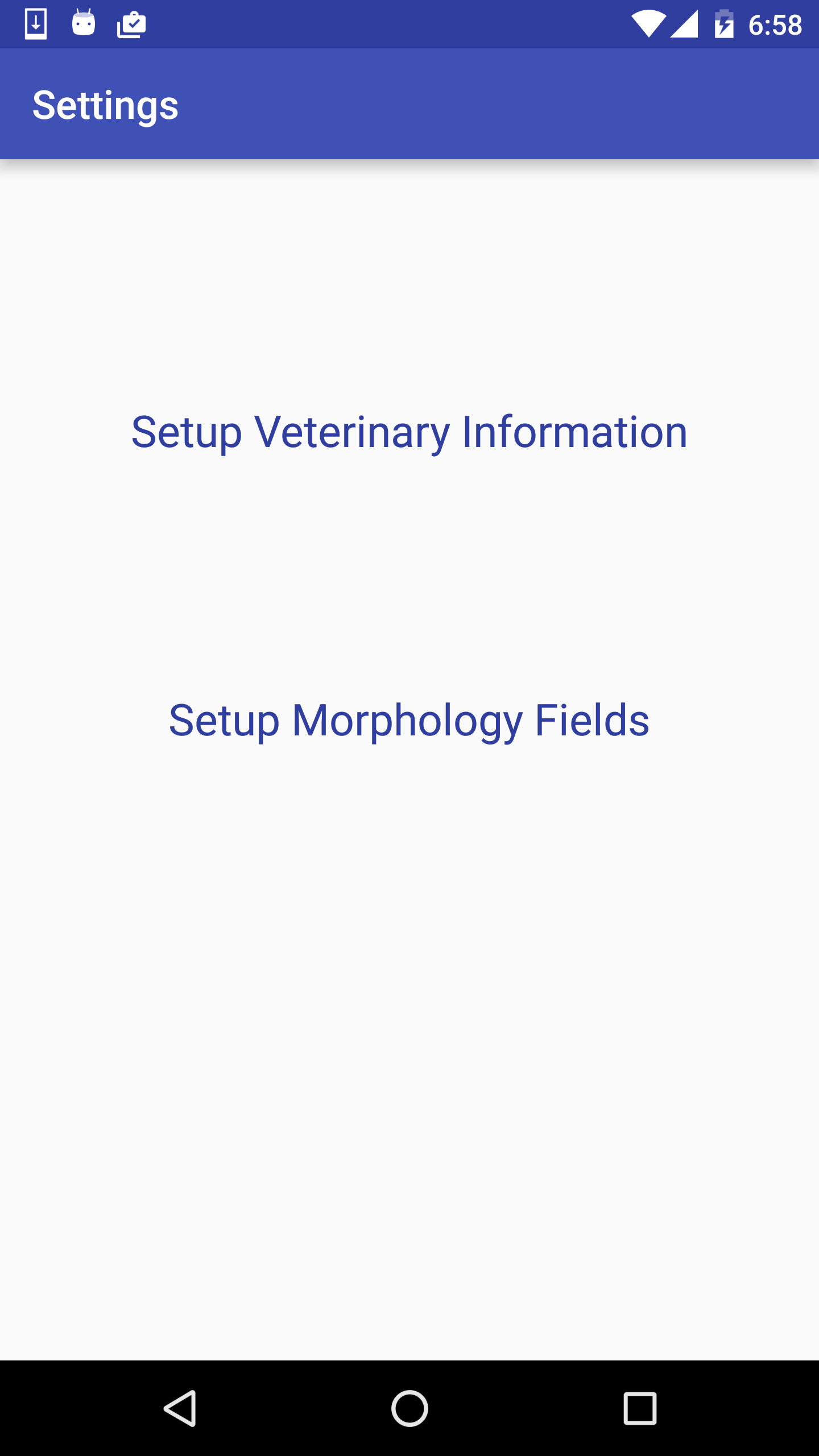 Upon opening the app for the first time after installation, veterinarian will be prompted to input personal information such as name and email address for the iPhone app. For the Android app, first-time users will be taken to a Settings page as shown below. From the Settings page users can fill personal information and morphology.